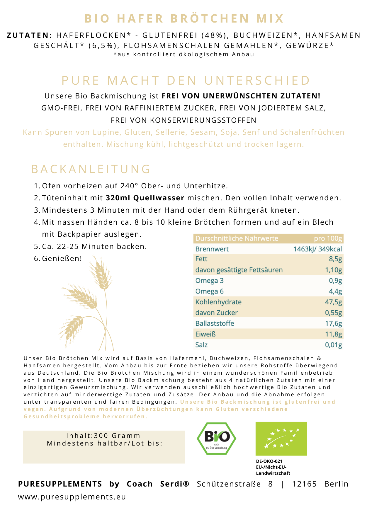 Unsere Bio Brötchen Backmischung basiert auf sorgfältig ausgewählten Zutaten wie glutenfreien, gekeimten Haferflocken, Buchweizen, Flohsamenschalen, Hanfsamen und ausgewählten Gewürzen. Die Rohstoffe stammen aus Deutschland und werden unter kontrolliert biologischen Bedingungen angebaut.