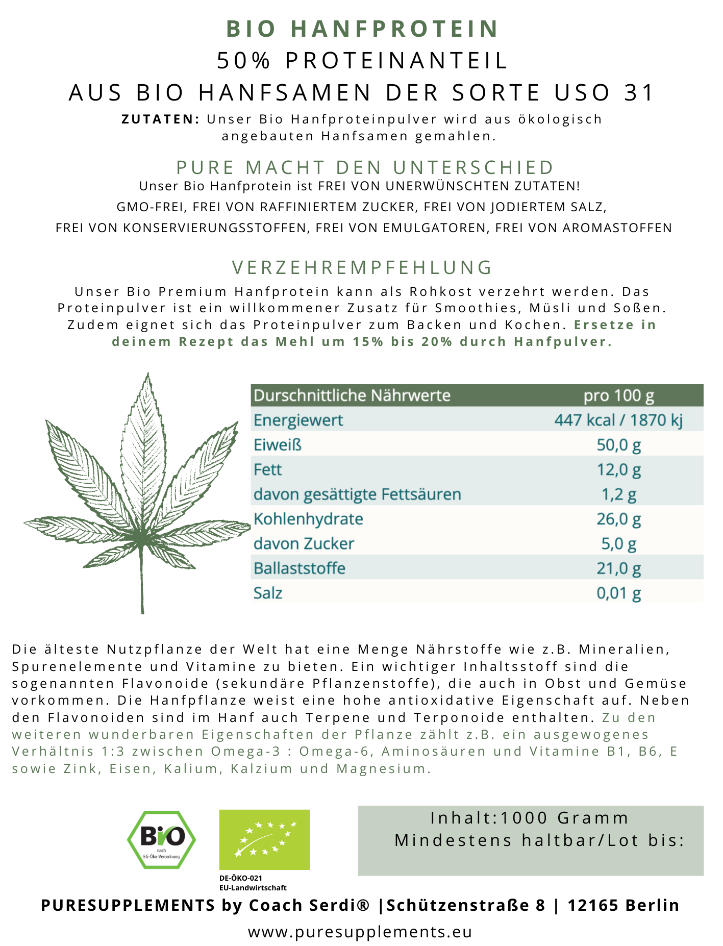 100% Hanfptrotein (hergestellt aus Hanfsamen aus kontrolliert biologischem deutschem-Anbau)