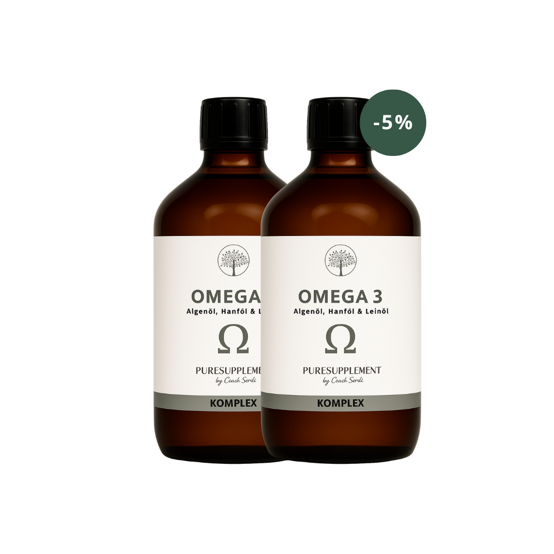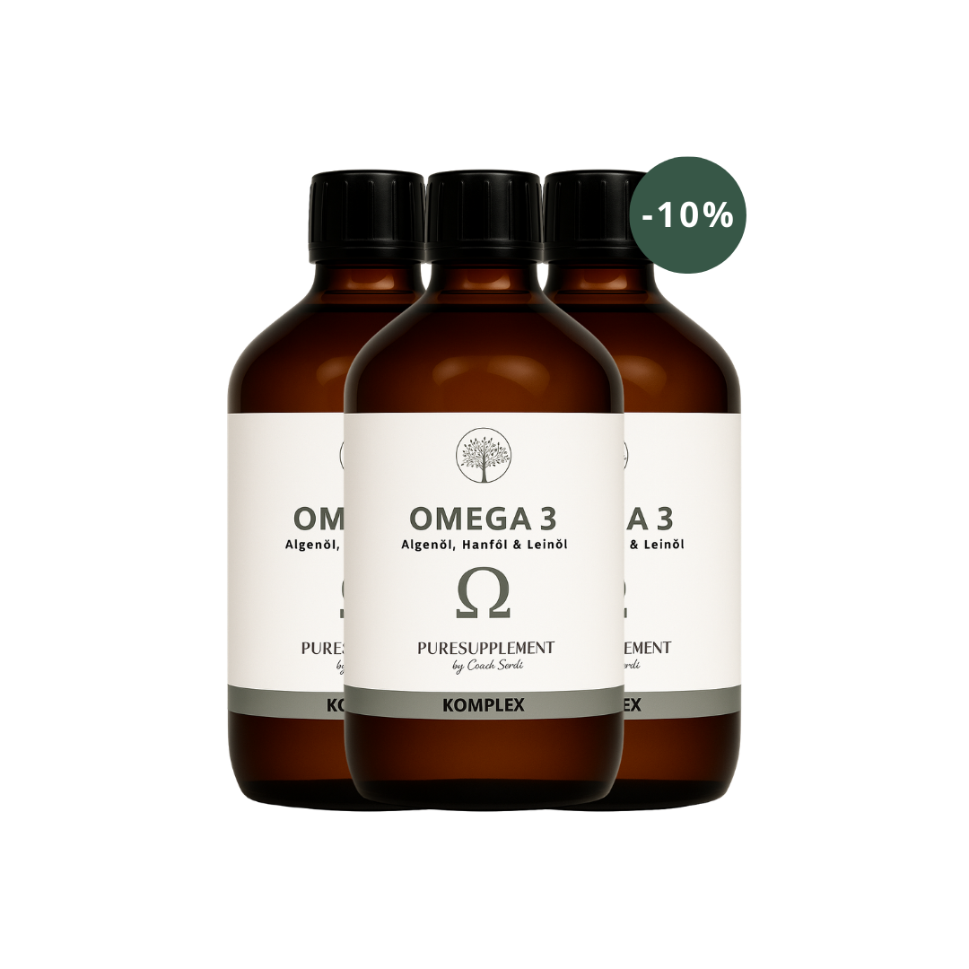 Unser Omega-3 Komplex kombiniert Algenöl mit Bio-Hanföl und Bio-Leinöl. Die Ölmischung liefert die Omega-3-Fettsäuren EPA (Eicosapentaensäure), DHA (Docosahexaensäure) und ALA (Alpha-Linolensäure) in pflanzlicher Form.