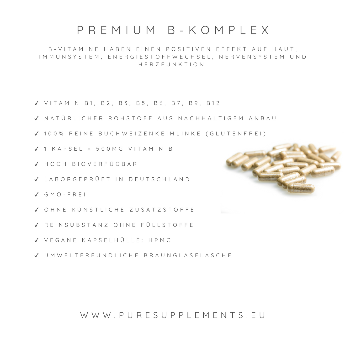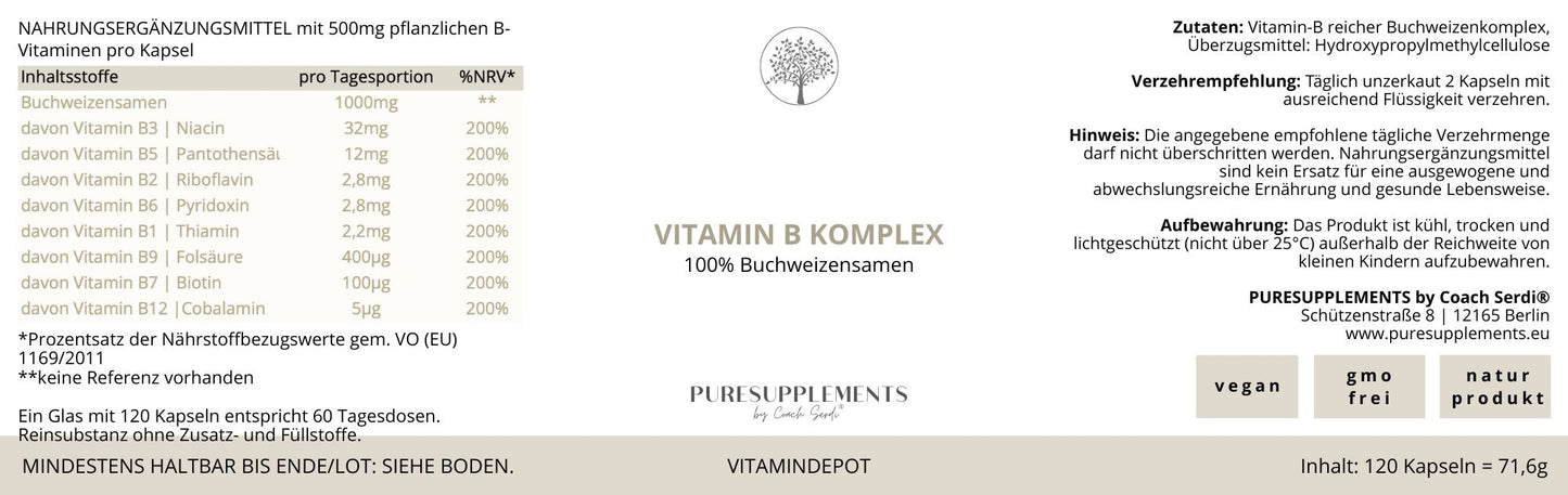 Premium Vitamin B-Komplex | aus Buchweizenkeimlingen | B1, B2, B3, B5, B6, B7, B9 & B12 | 120 Kapseln